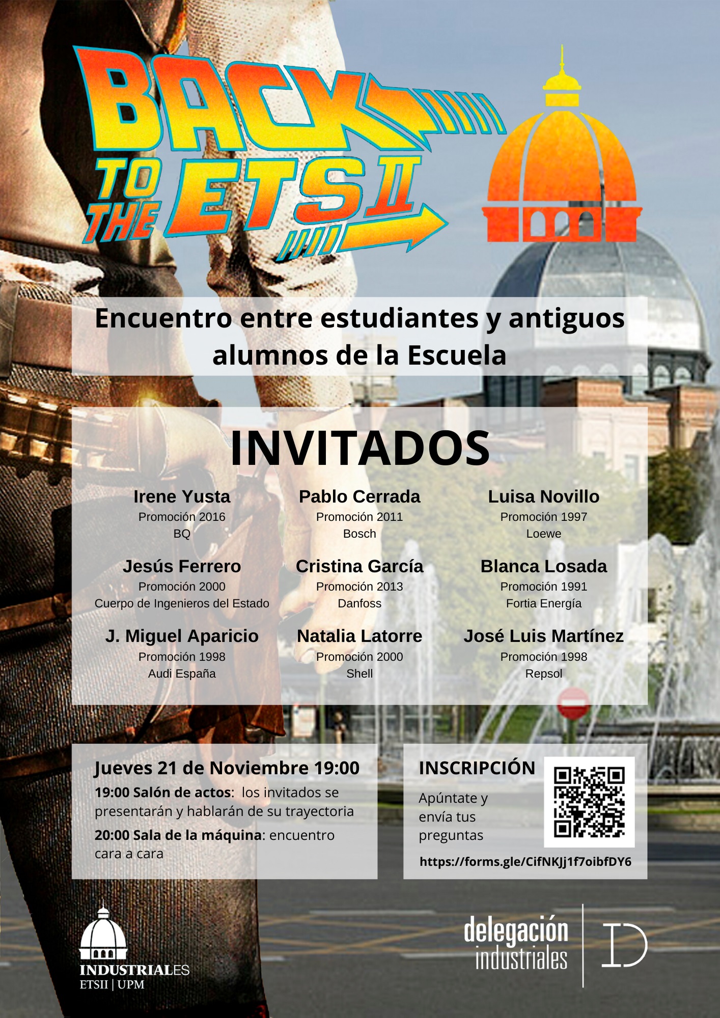 El jueves 21 de noviembre a las 19:00h contaremos con la presencia de antiguos alumnos y alumnas de la Escuela, en un encuentro con vosotros, los estudiantes de la ETSII, para que podáis preguntarles todo aquello que os interese de su paso por la Escuela y cómo ha influido en su trayectoria profesional.