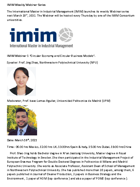 The International Master in Industrial Management (IMIM) launches its weekly Webinar series next March 18th, 2021. The Webinar will be hosted every Thursday by one of the IMIM Consortium universities.